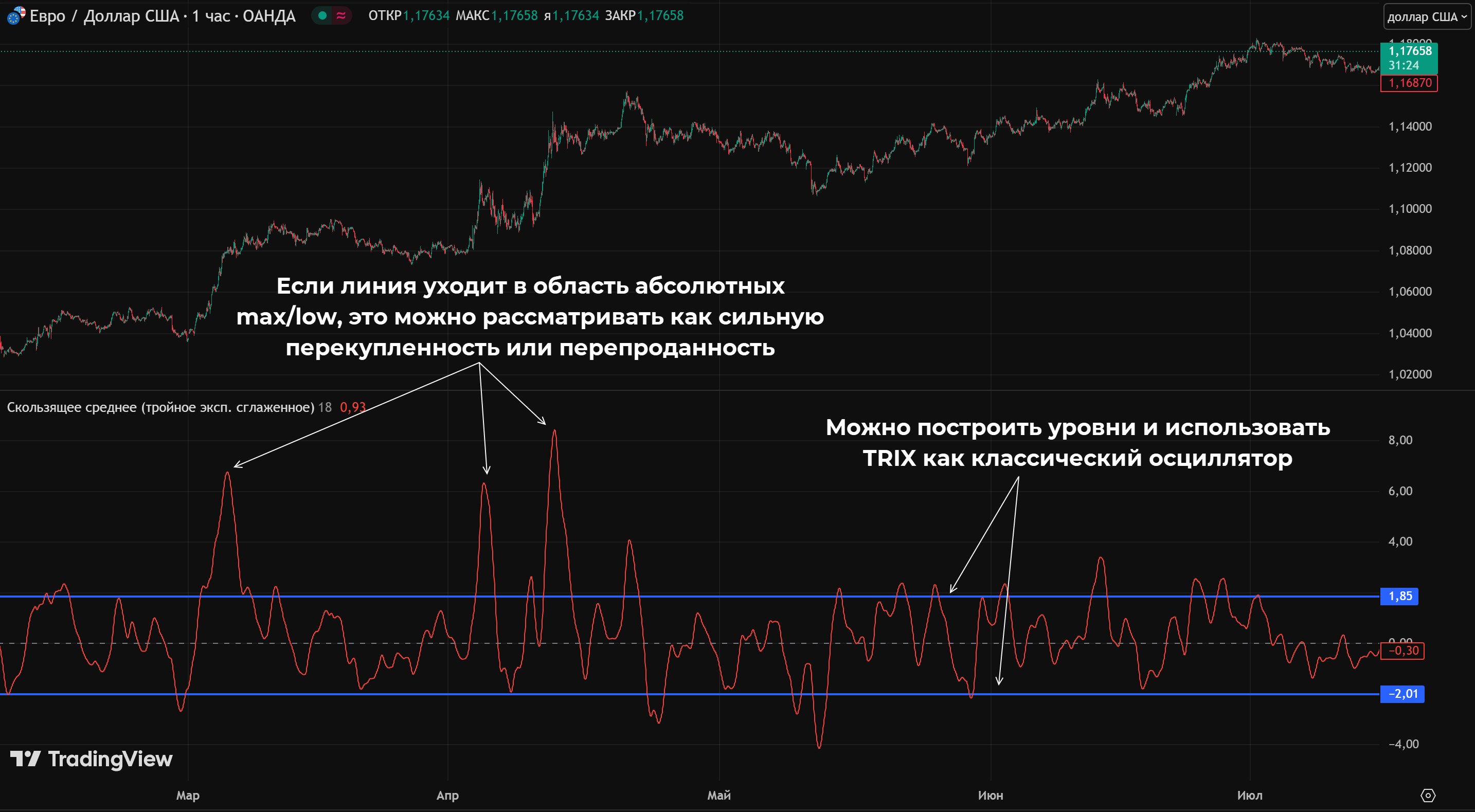 • TRIX. Индикатор отображает скорость роста/падения тройной экспоненциальной сглаженной ЕМА. Определение областей перепроданности/перекупленности – не основная задача TRIX, но индикатор может использоваться и в роли классического осциллятора. В работу можно брать периоды, когда линия стремительно уходит в область абсолютных максимумов/минимумов. Также можно вручную построить границы зон и ориентироваться на них.