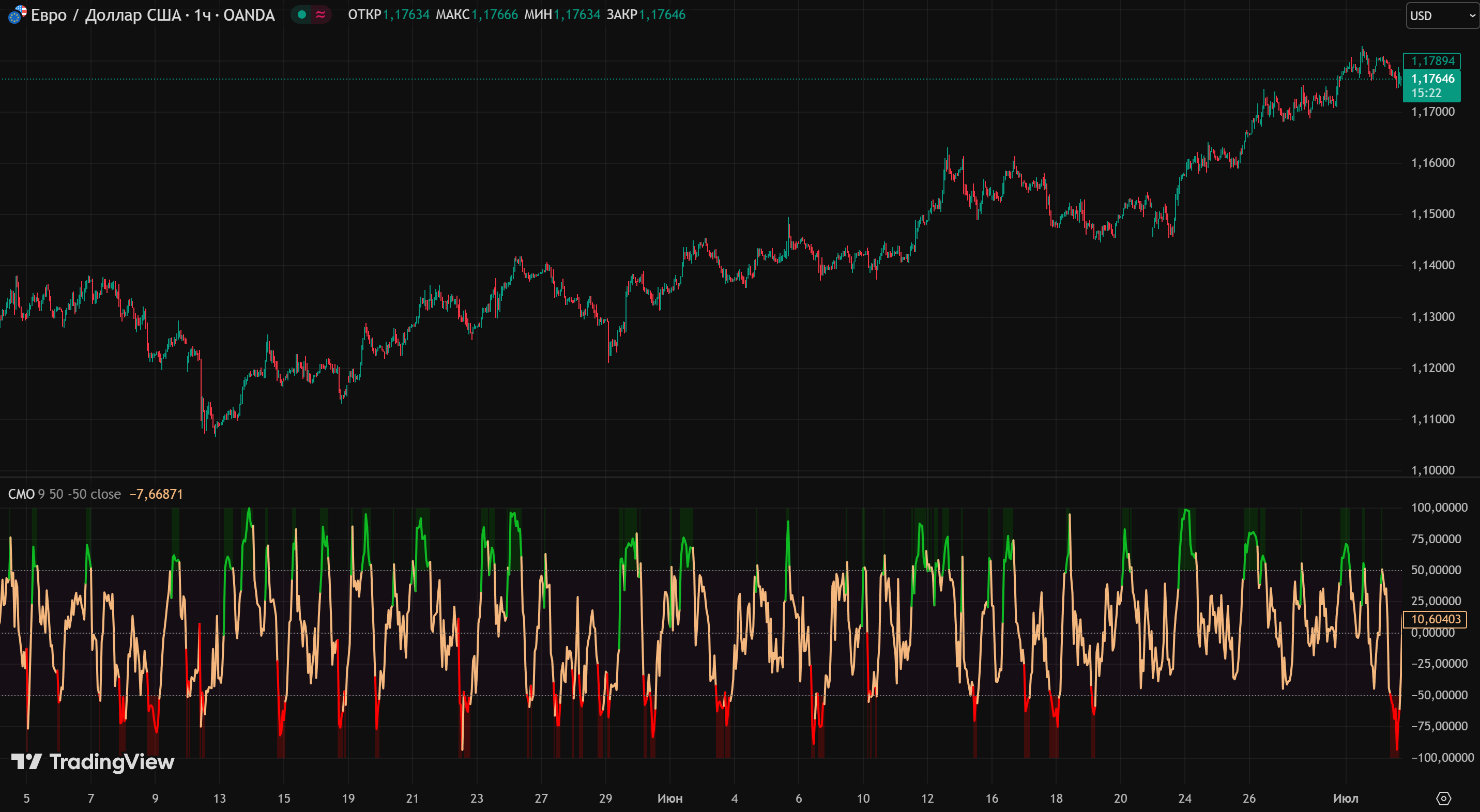 • Chande Momentum Oscillator. Логика похожа на индекс относительной силы. На каждой свече рассчитывается дельта – она положительная на бычьей свече и отрицательная на медвежьей. Затем на определенном отрезке подсчитывается сумма положительных и отрицательных дельт, на основе этого рассчитывается значение CMO. Значения выше +50 считаются признаком перекупленности, ниже -50 – перепроданными.
