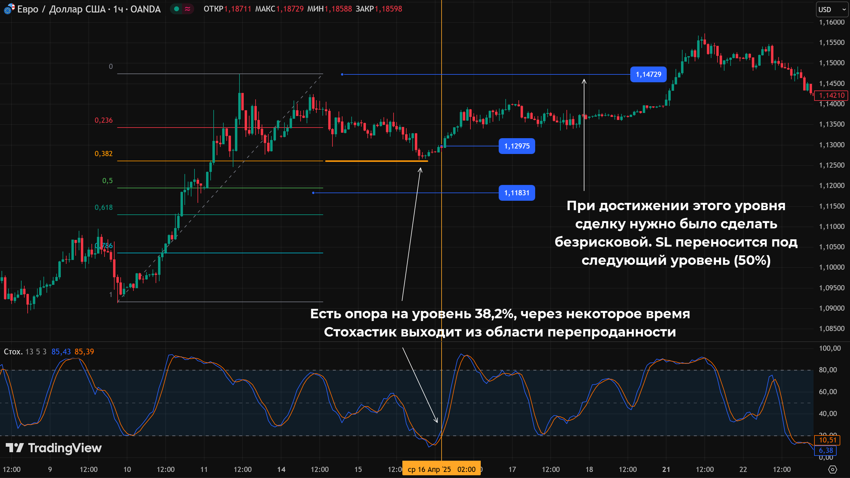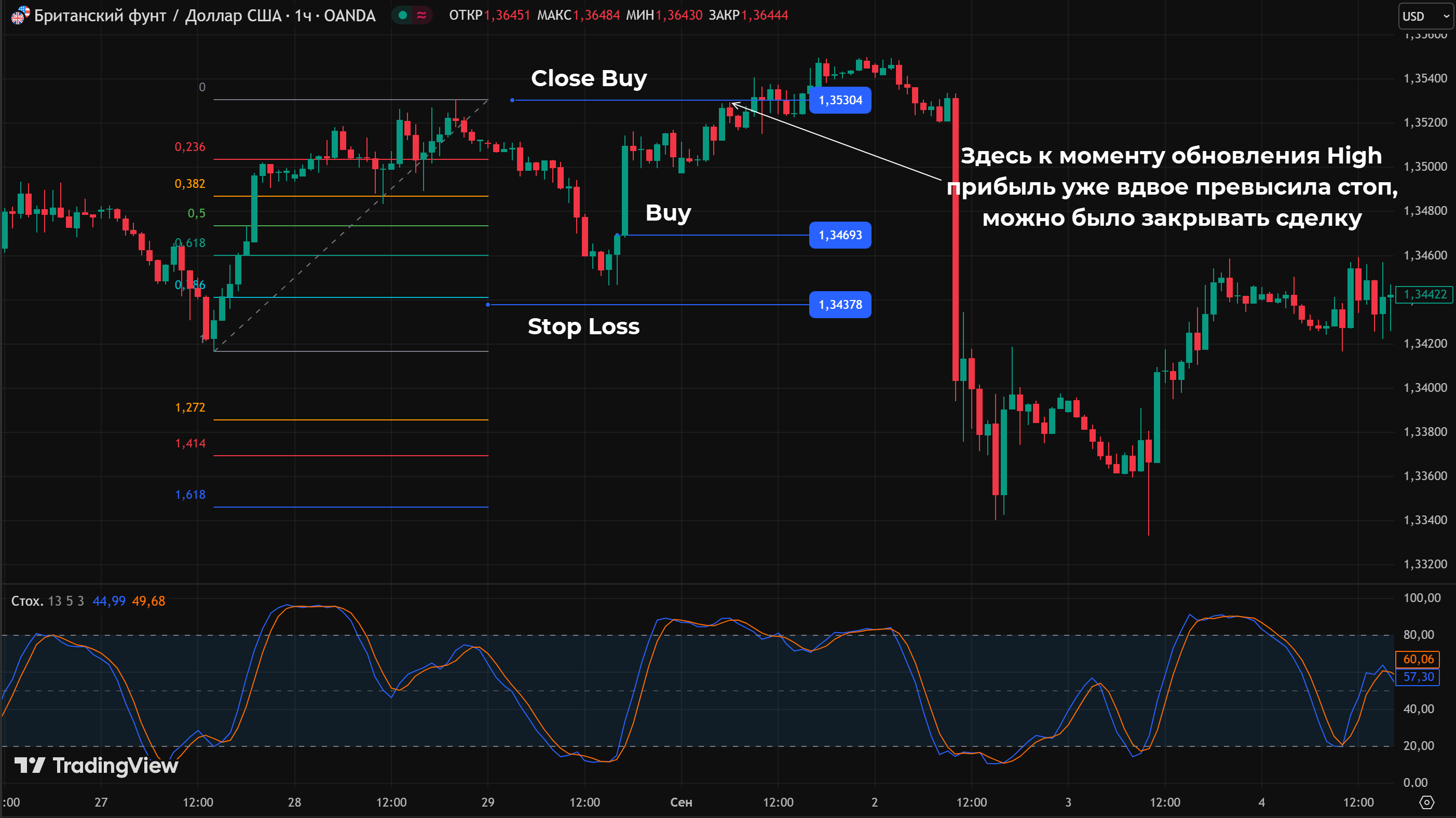 Точка входа выглядит как отбой от одного из уровней Фибоначчи с подтверждением в виде выхода Стохастика из перекупленности/перепроданности. Более агрессивный вариант – торговля после пересечения линий осциллятора, что дает более раннюю точку входа. Это базовые правила, их можно дополнить своими фильтрами, например, работать только в направлении тренда и не торговать при движении в горизонтальном канале.