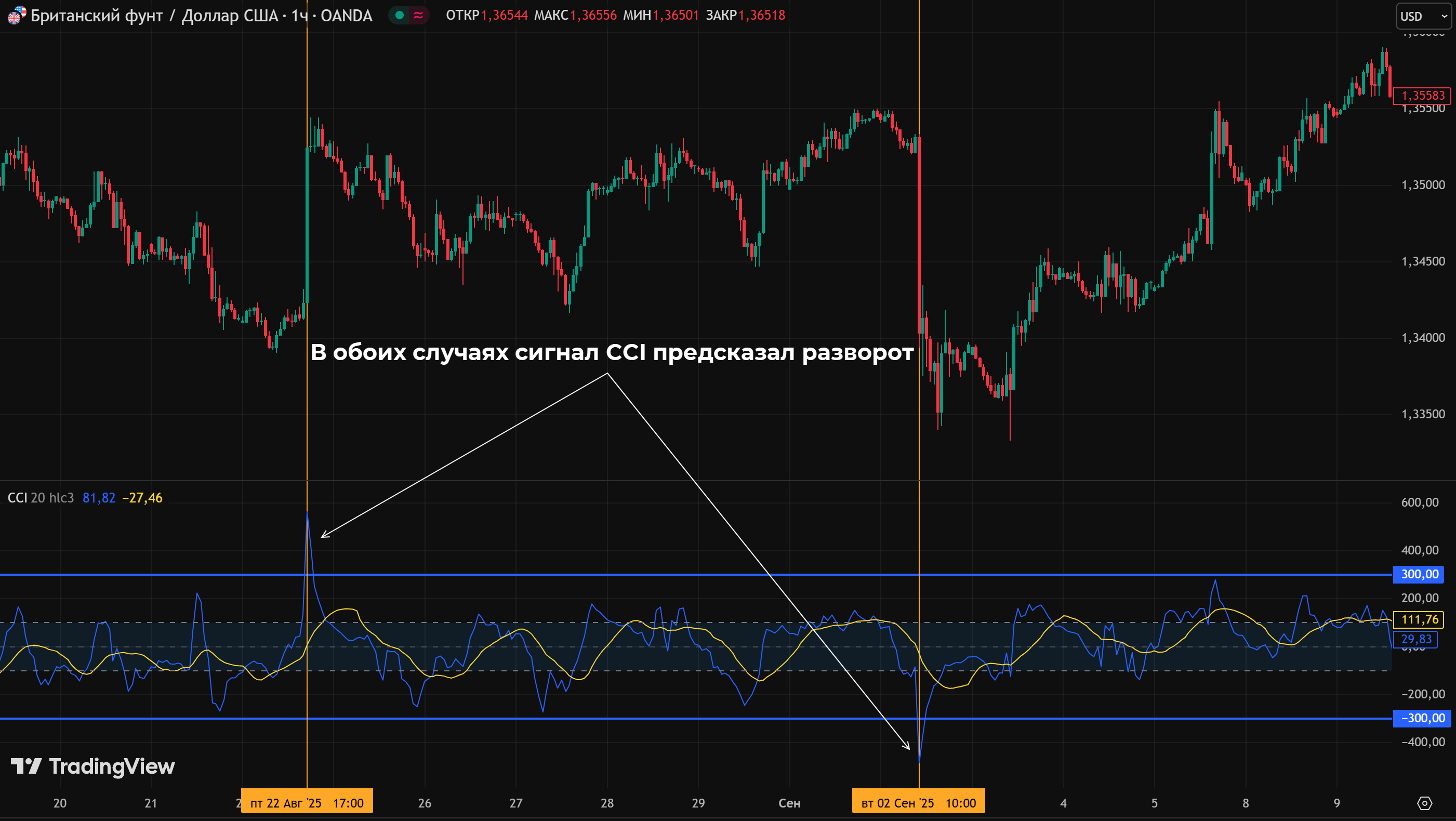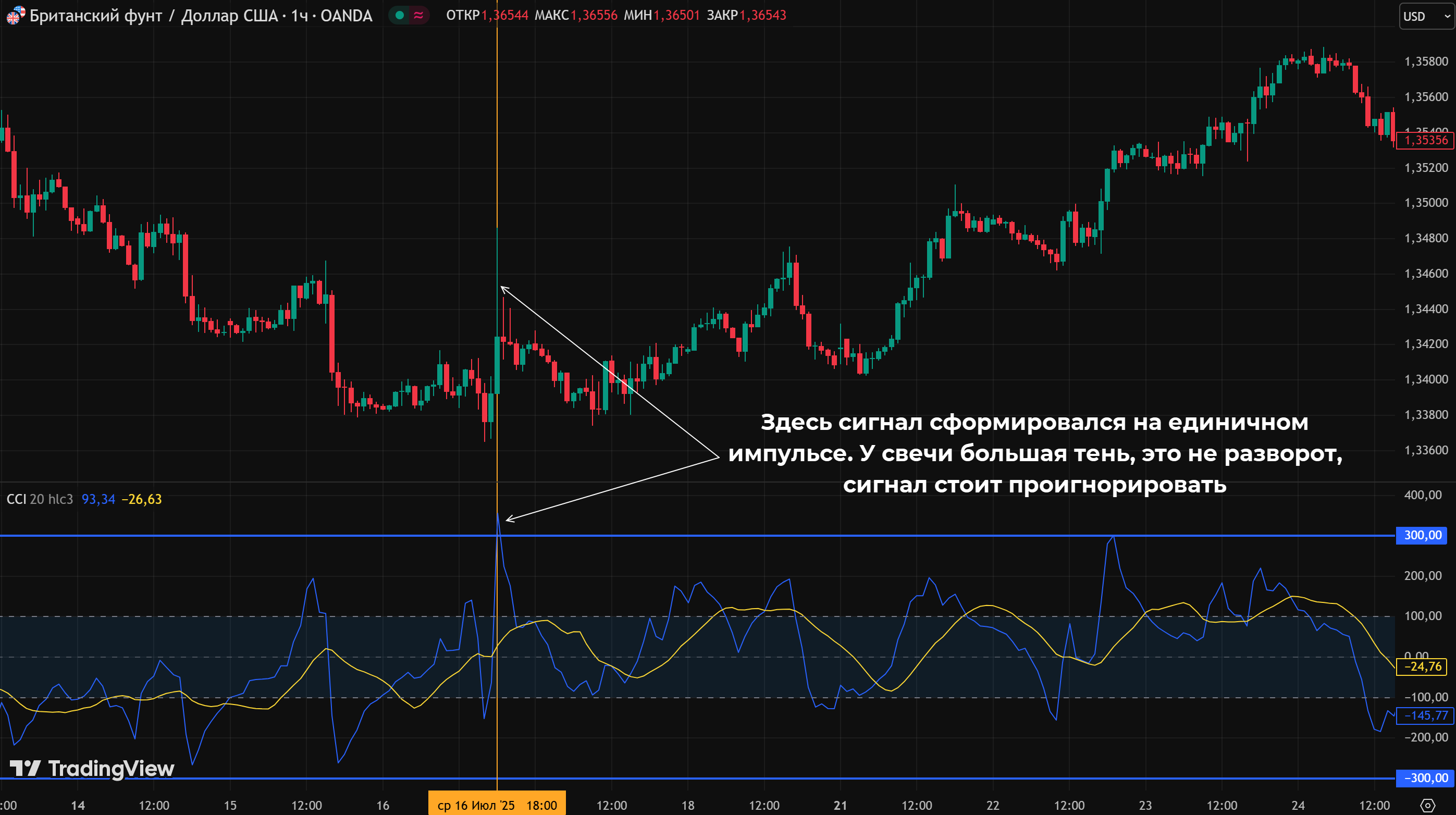Для поиска сигналов можно использовать индекс товарного канала (CCI). Перекупленностью и перепроданностью считаются области выше +100 и ниже -100 соответственно. Но нас интересуют экстремальные сценарии, лучше ориентироваться на уровни ±300, а на высоковолатильных активах – ±400.