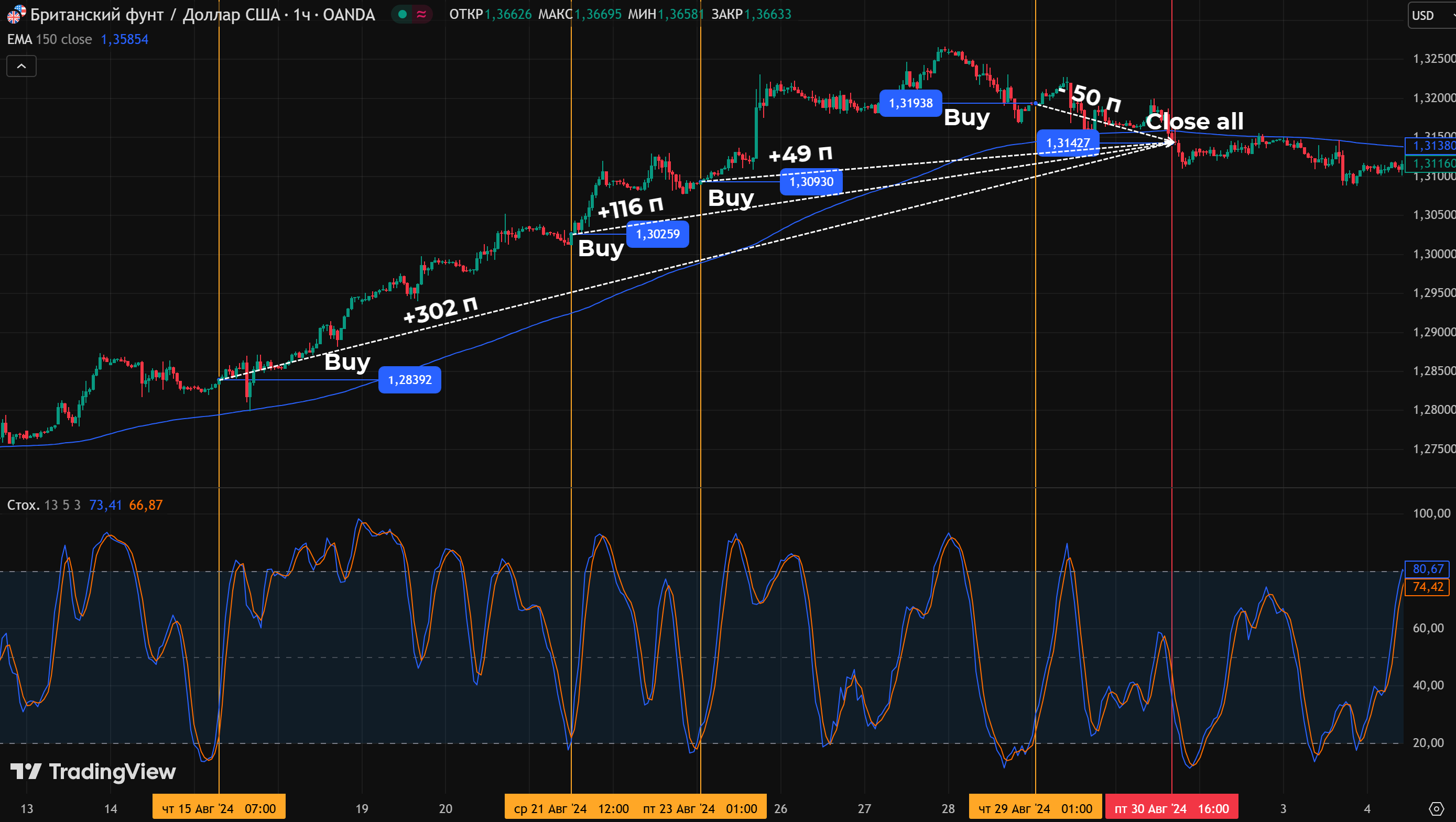 Сделка заключается в момент выхода пересечения границы зоны на Стохастике. Стратегия трендовая, поэтому трейдер может выстраивать серии прибыльных сделок. Можно использовать трейлинг-стоп, перемещая его по коррекционным экстремумам. В итоге вся серия закроется либо по стопу в прибыльной зоне, либо вручную при пересечении линии ЕМА.
