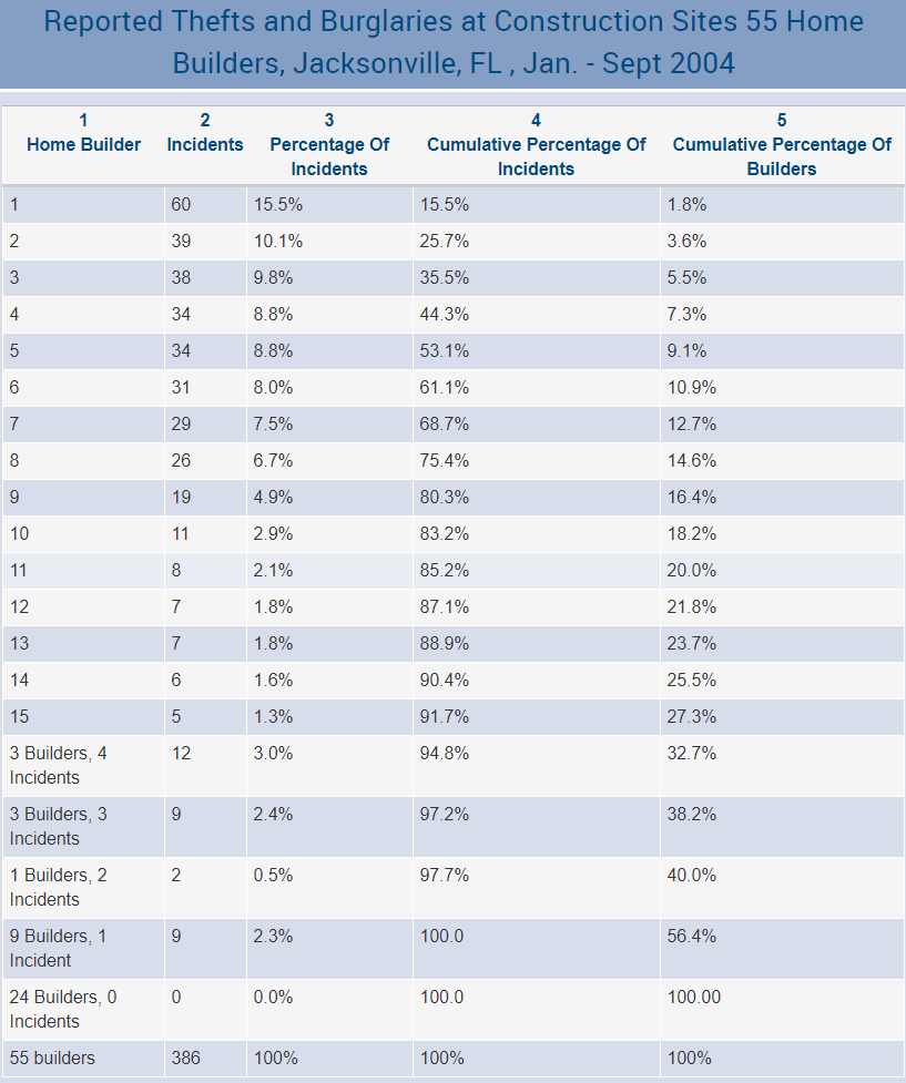 Любопытной выглядит статистика по кражам и кражам со взломами на стройках Джексонвилля за промежуток с января по сентябрь 2004 г.
