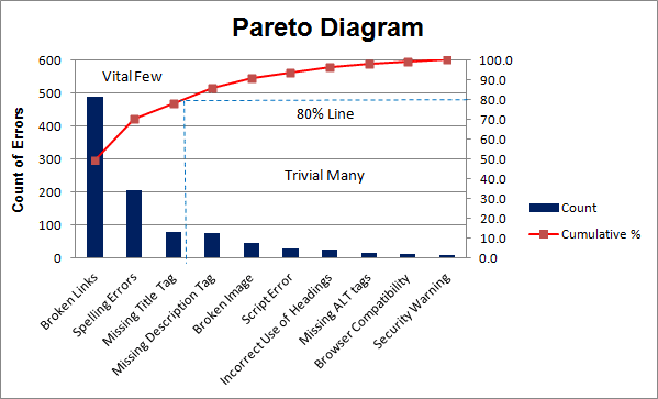 Диаграмма показывает, что 3 категории ошибок отвечает за 80% наблюдаемых ошибок. То есть 30% действий (ошибок) становится причиной 80% последствий (сбоев в работе сайта). Принцип Парето 80 20 позволяет выявить критически значимые категории проблем и решить их.
