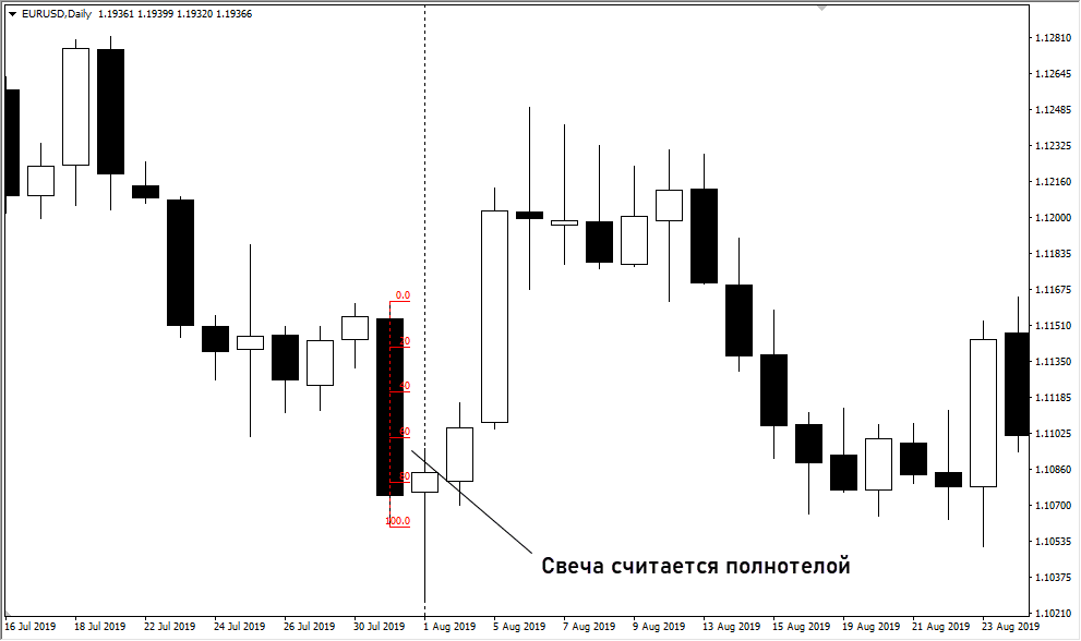 Идея заключается в том, что после полнотелой свечи на следующий день график продолжает движение в прежнем направлении, но есть 50%-ная вероятность разворота. С учетом этого и ведется торговля, используются только отложенные ордера.
