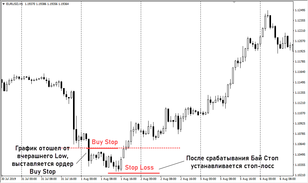 - как только пройдено нужное расстояние на уровне вчерашнего Low устанавливается стоповый ордер на покупку;