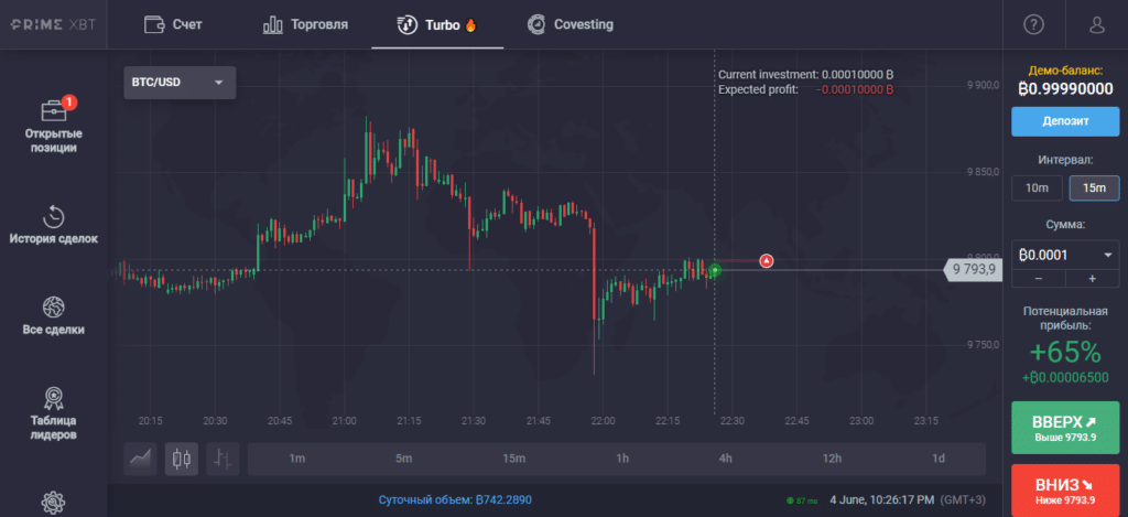 В личном кабинете PrimeXBT рядом с кнопкой «Торговля» расположилась ссылка «Турбо». Перейдя по ней, попадаем в раздел, где можно торговать бинарными опционами.
