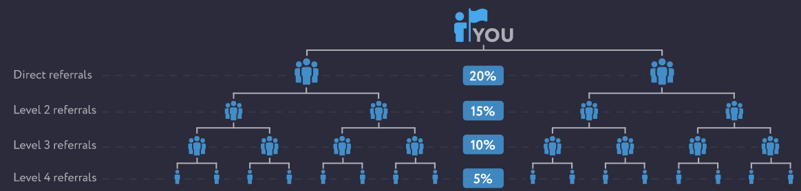 Биржа использует 4-уровневую партнерскую программу. Доход партнера PrimeXBT рассчитывается как часть комиссии, уплаченной рефералами. За рефералов 1-го уровня биржа платит 20% от своего дохода за счет комиссии, за 4 уровень – 5%.