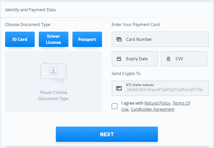 - можно купить ВТС за фиатную валюту с банковской карты. Для этого в окне пополнения счета нужно нажать на «Купить Bitcoin». Поддерживается покупка только с банковской карты (USD, EUR, GBP), а покупка криптовалюты происходит на CEX. Далее указывается email и страна проживания трейдера. На завершающем этапе указываются данные карты, также нужно приложить сканы документов и самой карты, это нужно для проверки платежа.