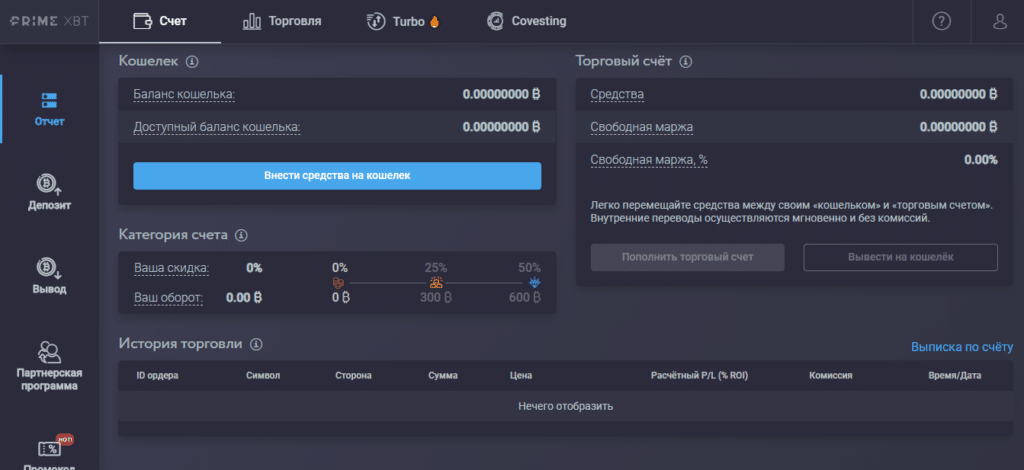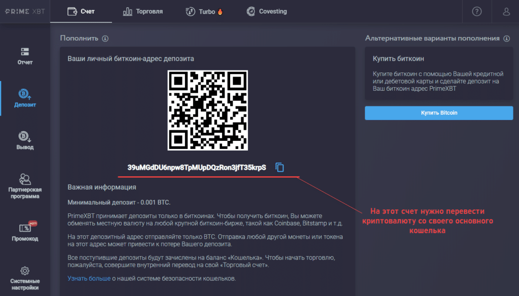 В отличие от обычных брокеров и бирж здесь нет массы вариантов пополнения счета и вывода средств. Работа ведется только с Биткоином, внести его на счет PrimeXBT можно 2 способами: