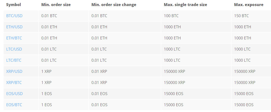 По криптовалюте есть ограничения по кредитному плечу и объему торговли. Так, минимальный объем сделки составляет 0,01 ВТС или 1 EOS при работе с этой криптой.