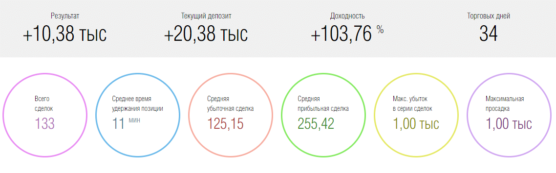 - выводится основная информация по торговле – сколько дней она велась, какова максимальная просадка в деньгах, средний профит, убыток и прочие детали;