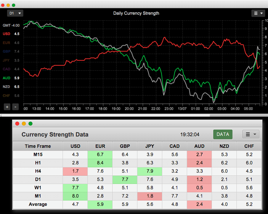 Как и сигналы от investing.com показания Currency Strength Meter не считаются основанием для немедленного входа в рынок. Это скорее фильтр сигналов основной торговой стратегии. Данные отображаются как в виде таблицы, так и в виде графиков.