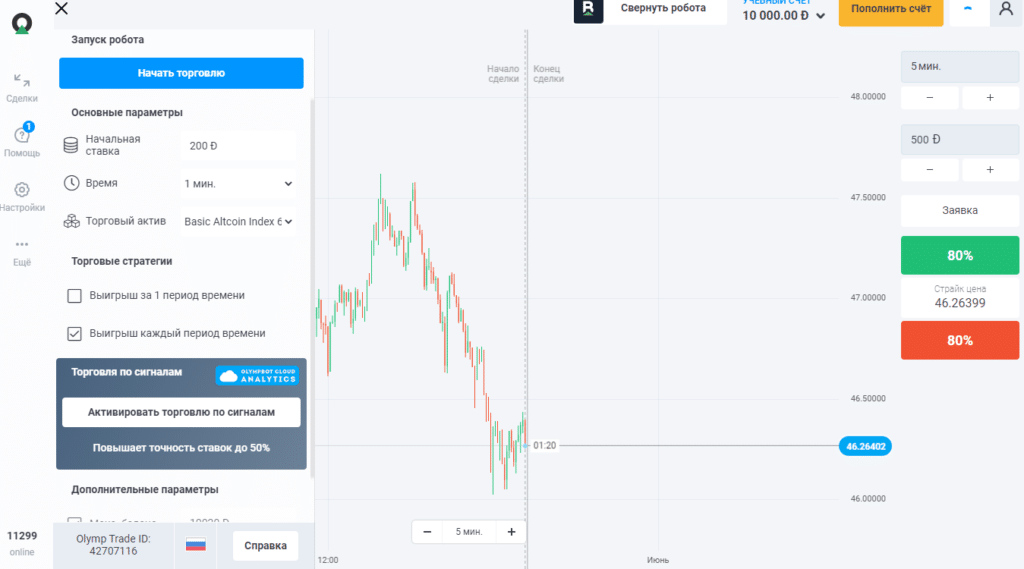 - трейдер задает ставку, срок экспирации, по какому торговому инструменту будет вестись торговля и тип стратегии;
