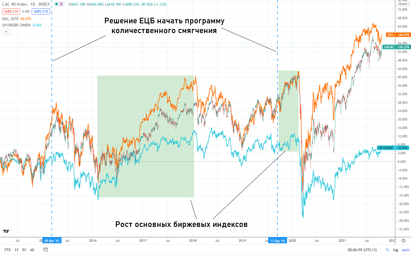 Для нас как для инвесторов куда важнее то, что qe в экономике чаще всего становится бычьим ф актором для фондового рынка. Если в какой-то стране объявляется количественное смягчение, то повышается вероятность роста ее основных индексов.
