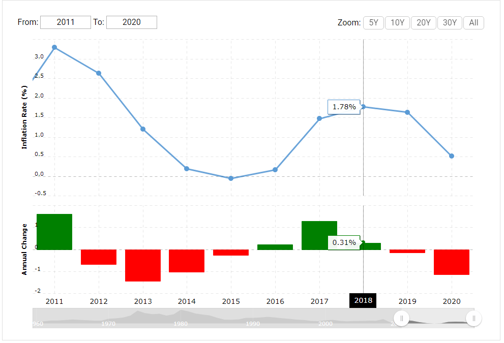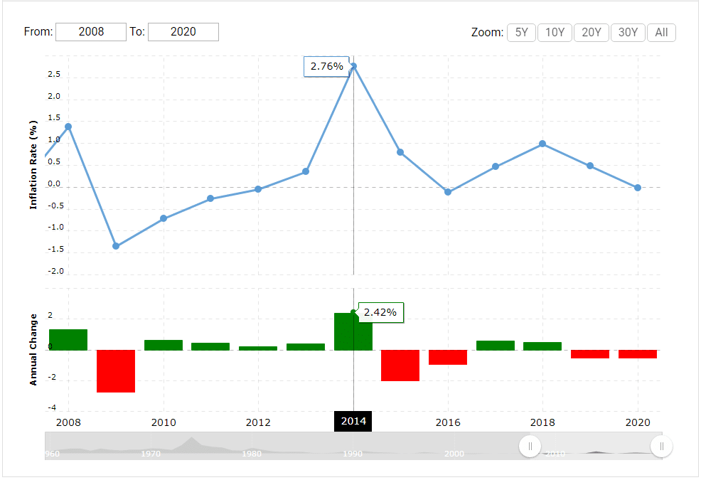 После активизации покупки активов наметились улучшения с инфляцией. К 2012 г. она вышла на нулевой уровень, а в 2014 г. зафиксирован максимум – 2,76%, для японской экономики – это солидное достижение.