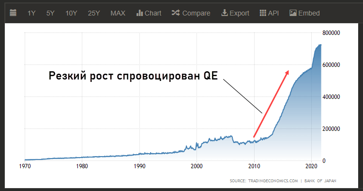 - В 2010 г. Япония вернулась к QE, ставки на тот момент находились на уровне 0,1%, регулятор опустил ставку еще ниже – до -0,1%, началась покупка активов. С 2013 г. началась активизация программы Quantative Easing, возник такой термин как «Абэномика» (на тот момент Синдзо Абэ занимал пост премьер-министра Японии). По объемам QE Япония практически сравнялась со штатами, в США тогда месячный объем покупки активов составлял $85 млрд, а в Японии – $70 млрд. В 2017 г. стало известно, что в результате многолетней покупки активов баланс BoJ превысил $4,5 трлн.