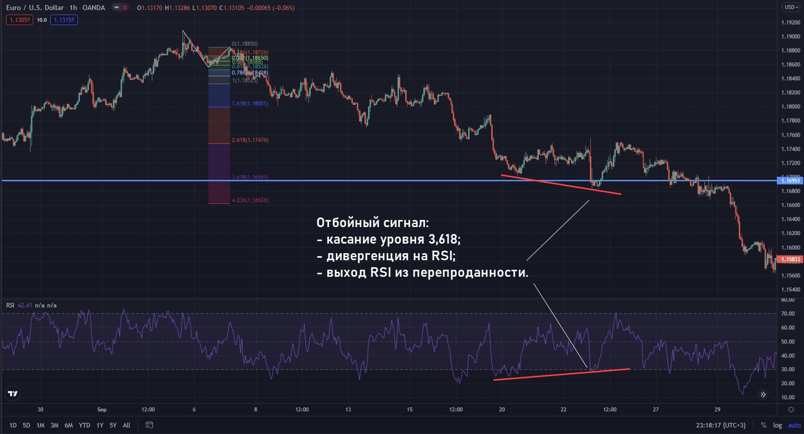 - Поддержка на 1,618 – отработка есть. Сначала был отскок с недоходом в 8 пунктов, затем консолидация перед 1,618 и решительный пробой.