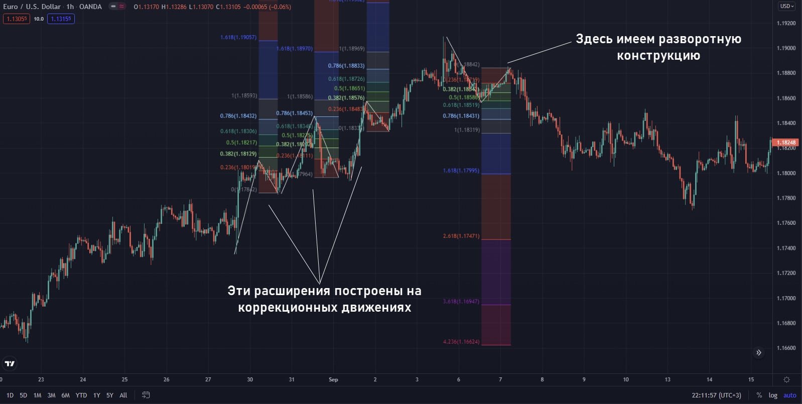 - Искать разворотные сигналы в зоне около расширений. При таком сценарии возможна контртрендовая работа, вероятность разворота выше, если разворотная модель появляется на уровне 1,618 или следующих за ним.