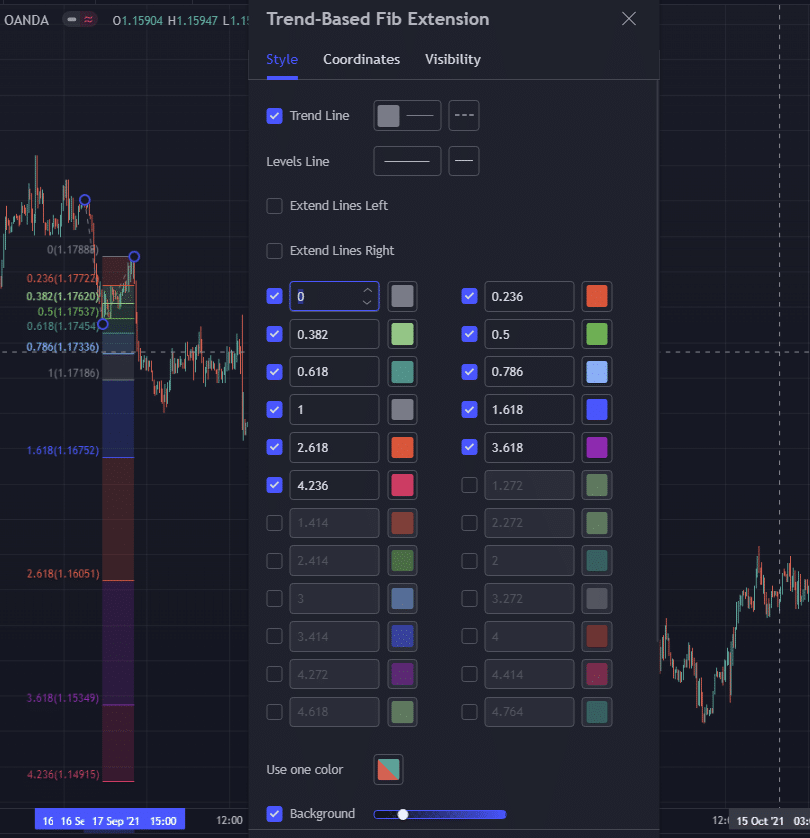 Через настройки Trend—based Fib Extension можно добавить любые произвольные уровни и задать нужные визуальные настройки. На живом графике от TradingView удобно то, что в настройках уже заданы нужные уровни, можно просто отключить их отображение.