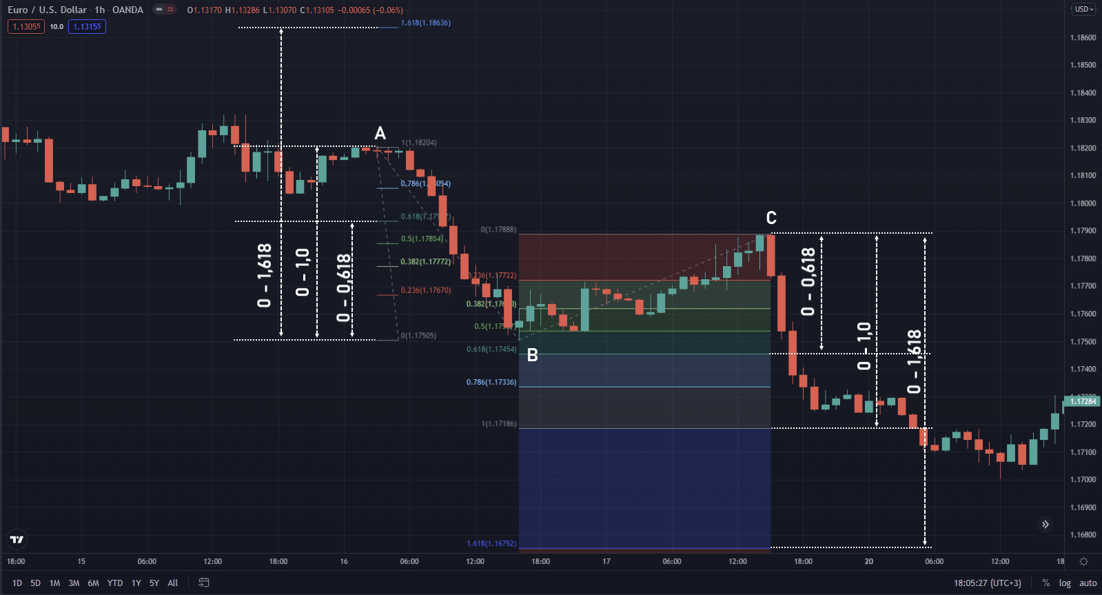 Для определения положения уровня 0,618 нужно из точки С отложить отрезок, равный расстоянию от 0 до 0,618 по Фибо уровням, растянутым на движение АВ. По тому же принципу определяется положение других уровней