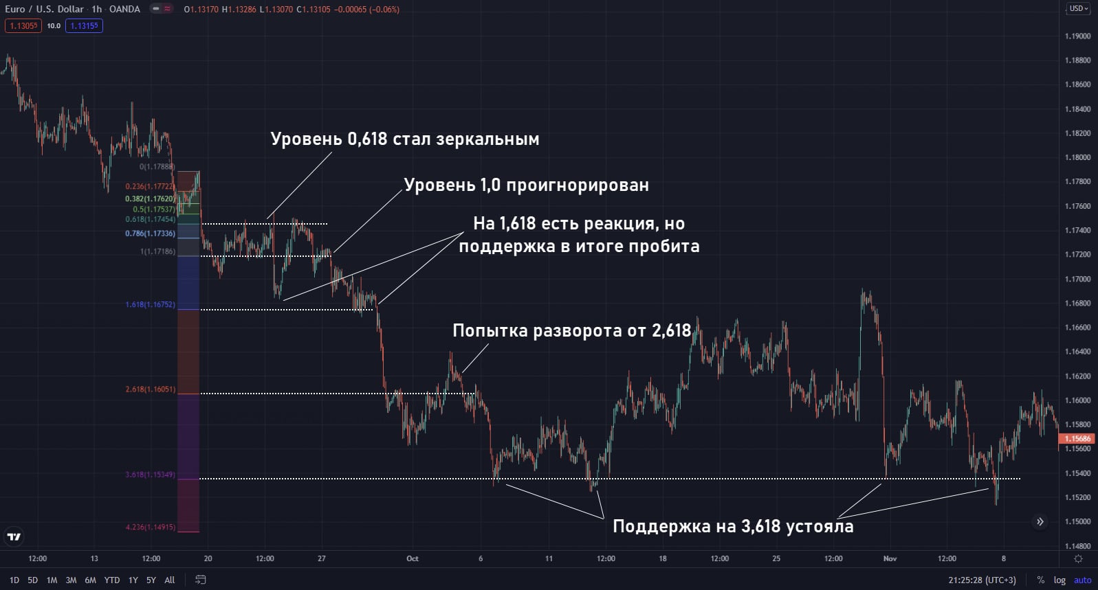 При работе с Fibo extension нет смысла привязываться к уровням с точностью до пункта. Они могут пробиваться, ложно пробиваться, цена может игнорировать их. Также важно не только учитывать положение поддержки/сопротивления, но и анализировать характер движения цены в этой зоне.