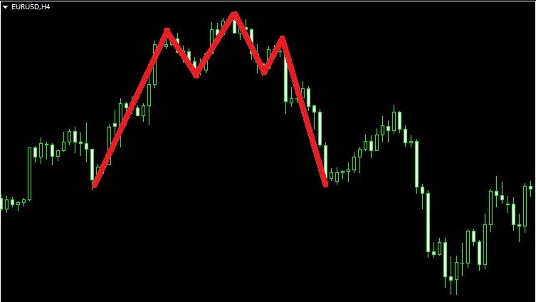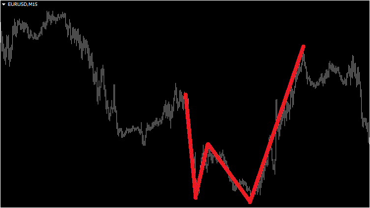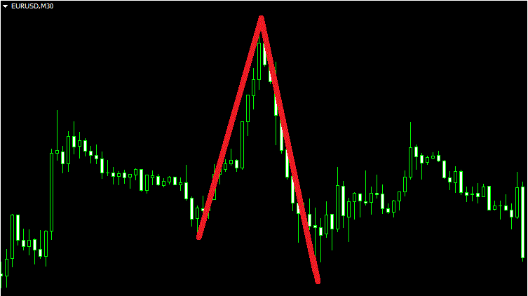 Это очень легко определяемая разворотная модель на форекс, в составе которой есть всего лишь две волны. Общая форма должна быть похожей на букву V. Данная модель часто формируется в конце сильных трендов, когда уже практически не остаётся значительных объёмов на рынке, заключительное движение происходит весьма динамично, после чего начинается столь же динамичный откат, который зачастую впоследствии превращается в смену тренда.