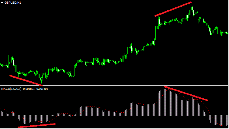 Диаграмма, также как и график, постепенно растёт, и вместе с первым графическим экстремум рисует ему соответствующий в своём окошке. Далее происходит снижение, и затем при возобновлении тренда, диаграмма также начинает расти, но только новый экстремум не появляется, то есть уровень первого не преодолевается. Эта ситуация говорит о том, что тренд выдыхается и вот-вот начнётся разворот.