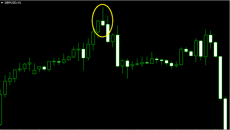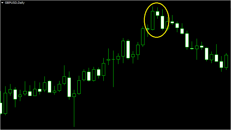 Важной деталью можно назвать разнонаправленное закрытие тел свечей, то есть на растущем рынке первая закрывается ростом, вторая – падением. Если перейти на малые периоды, то увидим, что это будет двойная вершина. Да и вообще, наличие одних моделей в составе других, более крупных – совсем не редкость.