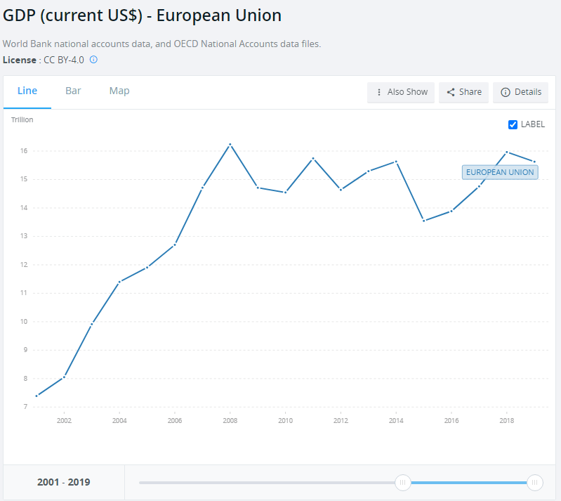 - Долговой кризис в ЕС. Опасения по поводу долгов проблемных стран ЕС возникли еще в конце нулевых, к началу 10-х годов это стало проблемой. ВВП до сих пор не обновил максимум 2008 г.