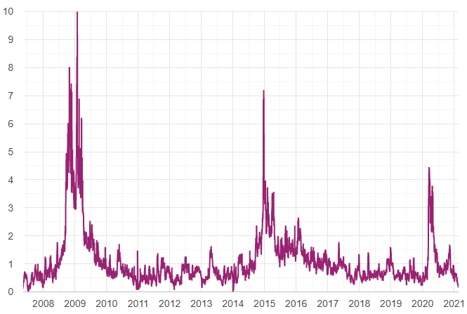 Если значение индекса поднимается выше 2,5, то считается, что высока вероятность возникновения кризиса в финансовом секторе. Пиковые значения наблюдались во время мирового финансового кризиса в конце нулевых, затем в 2014-2015 гг. и в 2020 г. после объявления пандемии коронавируса. Индекс финансового стресса подходит на роль барометра, предсказывающего спады в экономике.