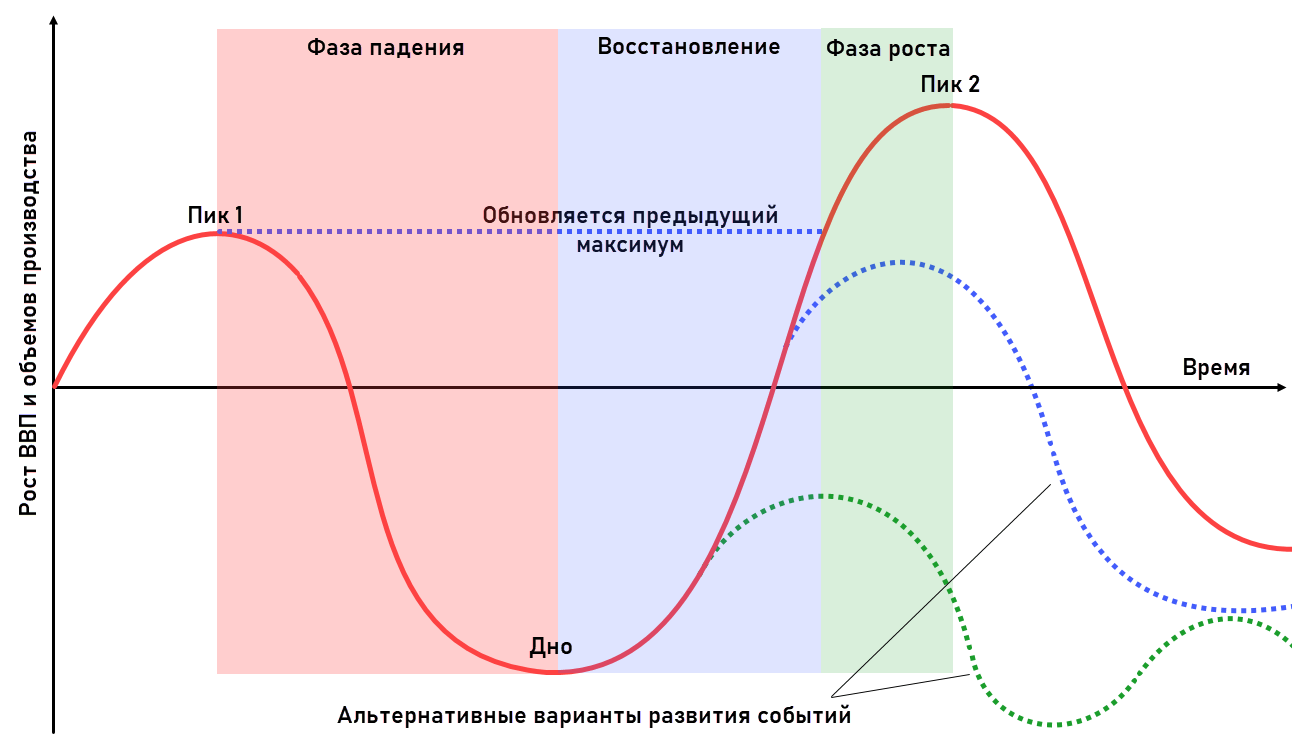 Выше описан идеальный сценарий, в реальности гарантий обновления максимума нет. В рамках новой волны роста предыдущий максимум может быть не переписан. В таком состоянии экономика может находиться годами и даже десятилетиями.