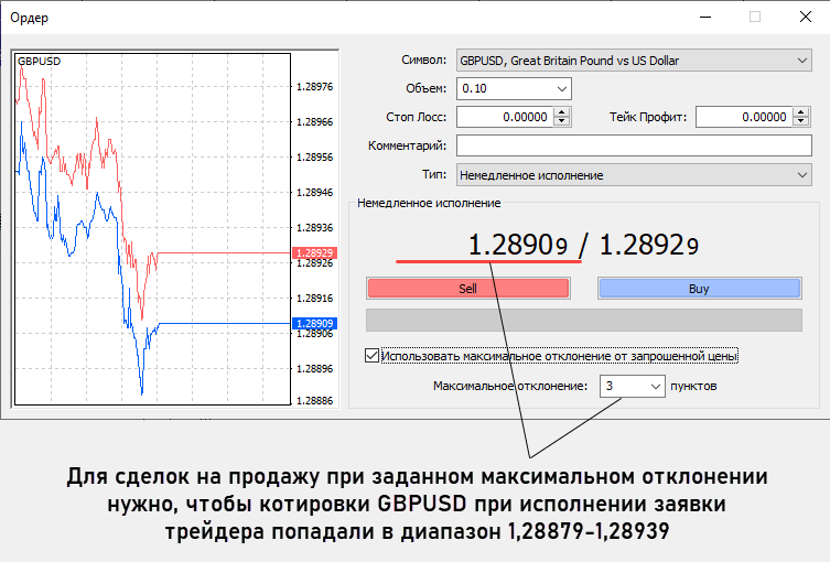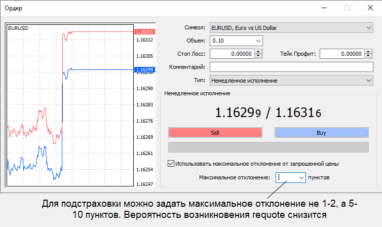 Если за время обработки приказа котировки инструмента не выйдут за указанный диапазон, то реквоты не будет. Вместо этого произойдет slippage – сделка будет заключена по изменившейся цене.