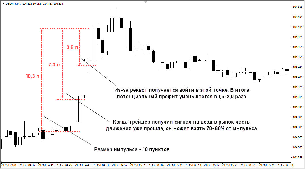 Влияние requote растет со снижением рабочего таймфрейма и цели по сделке. Если средний тейк-профит равен 40-60 пунктам, то потеря 2-3 пунктов из-за реквоты не будет критичным. Но если работа ведется, например, на М1 и по сделке в среднем берется 10-20 пунктов, то реквоты могут снизить прибыль на 30-40%.