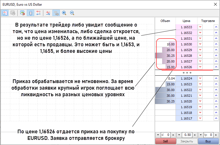 - визуально кажется, что приказы обрабатываются мгновенно, но в реальности это занимает доли секунды. Если за это время появится крупный покупатель (несколько покупателей), поглотивший всю ликвидность на уровнях или крупные игроки уйдут, то трейдер может увидеть реквоту или случится проскальзывание. То есть сделка исполнится не по 1,16526, а по 1,1655, на импульсных движениях может появляться и большая разница между ценой приказа и ценой исполнений. Проскальзывание может быть полным, когда весь объем исполняется по новой цене, или частичным. При частичном slippage объем исполняется частями на разных уровнях, и средняя цена отличается от той, по которой оформлялась заявка. Этот сценарий возможен лишь при больших объемах.