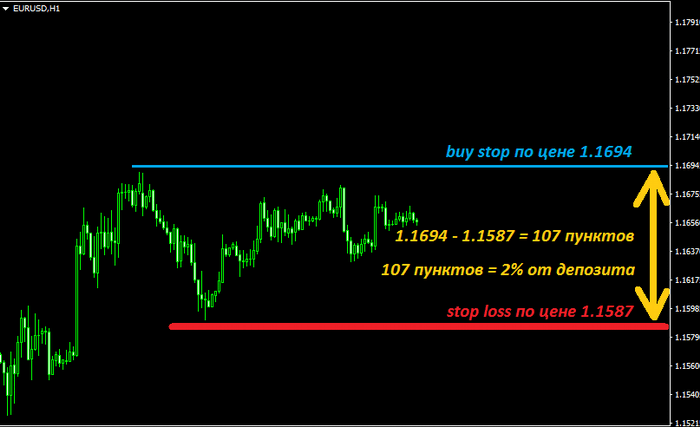 - определяется точка входа и выхода по торговой системе, а также stop loss, все эти величины выражены в пунктах;