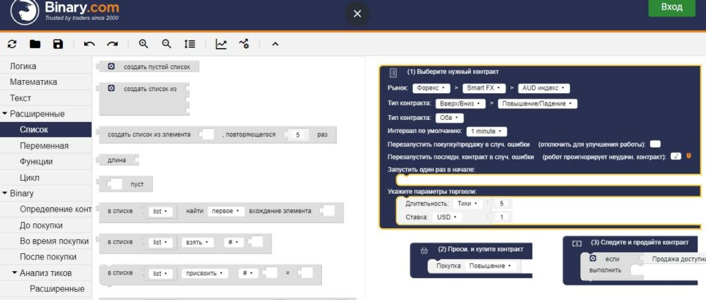 - Попробовать самому создать бесплатный робот для бинарных опционов в конструкторе. Не всем подходит и нет гарантии, что, понимая стратегию вы верно составите торговый алгоритм. Визуализация создания кода помогает, но задача для новичка все равно непосильная. Если сомневаетесь, попробуйте на сайте binary.com войти в конструктор, и создать хотя бы простенький робот для бинарных опционов;