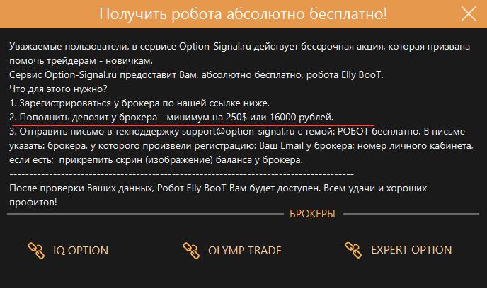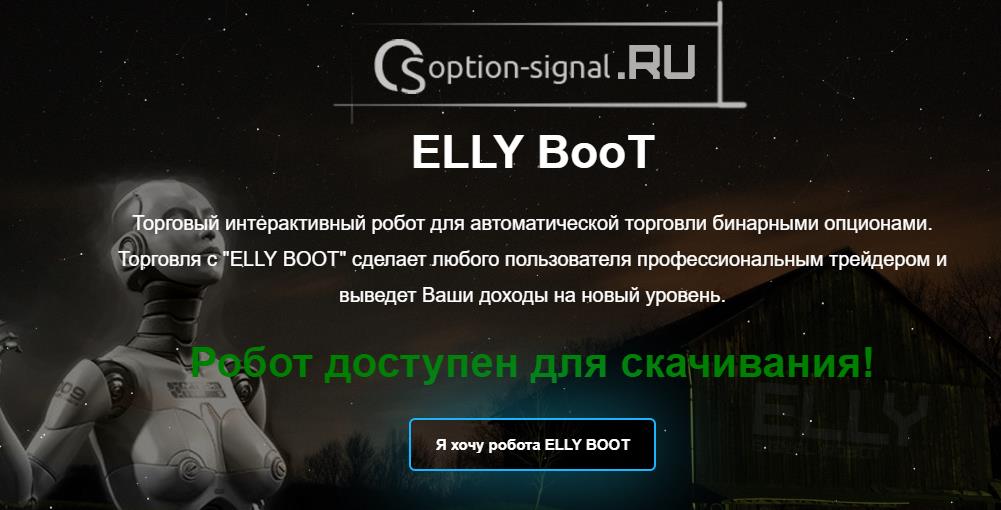 В рунете один из самых распиаренных роботов в последние годы. На сайте разработчика помимо самого торгового алгоритма продают еще и сигналы. При покупке Elly Boot обещают дать месяц бесплатных сигналов. Робот для опционов с таким предложением покажется просто сказкой.