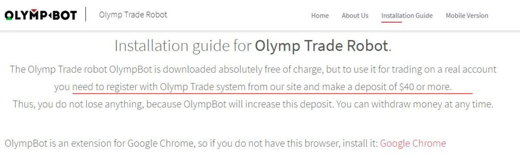 Этот робот для брокера Олимп Трейд. Представляет собой расширение для браузера, есть версия для демо счета, не требующая ни оплаты, ни подписки. На официальном сайте нет вообще никакой конкретики, кроме упоминания того, что винрейт стабильно составляет 72%. Из описания становится ясной и логика разработчика – чтобы подключить бот к реальному счету нужно пополнить счет у Olimp Trade как минимум на $40.