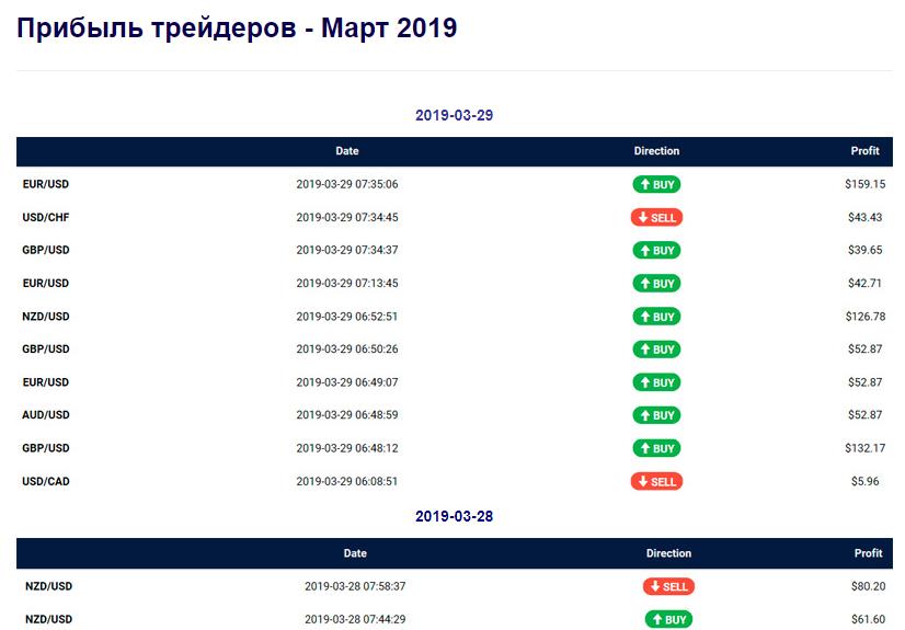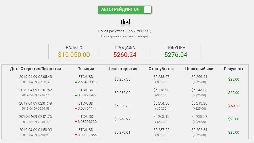 Но и это не главное. Основная претензия в том, что демонстрационный режим – эмуляция торговли на том же сайте, через который продается робот. Не отображается даже график, только количество действий торгового робота и цены, по которым он входит в рынок. Результат выводится в виде таблицы, и он всегда положительный, тест запускался неоднократно и ни разу не было периода, когда убыточных сделок было бы больше, чем прибыльных.