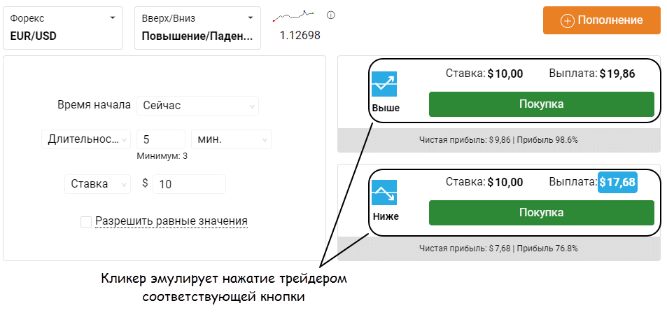 - Кликеры – эмуляторы нажатий на кнопки Call, Put. Они разрабатываются под веб терминалы. Схема работы выглядит так – в отдельной вкладке запускается торговая платформа, отдельно запускается робот для опционов. Работа ведется до тех пор, пока открыт терминал. Со стороны брокера все выглядит так, как будто трейдер торгует вручную. Обычно при покупке такого типа ПО продавец адаптирует алгоритм под терминал вашего брокера (или в настройках предусмотрены соответствующие кнопки);