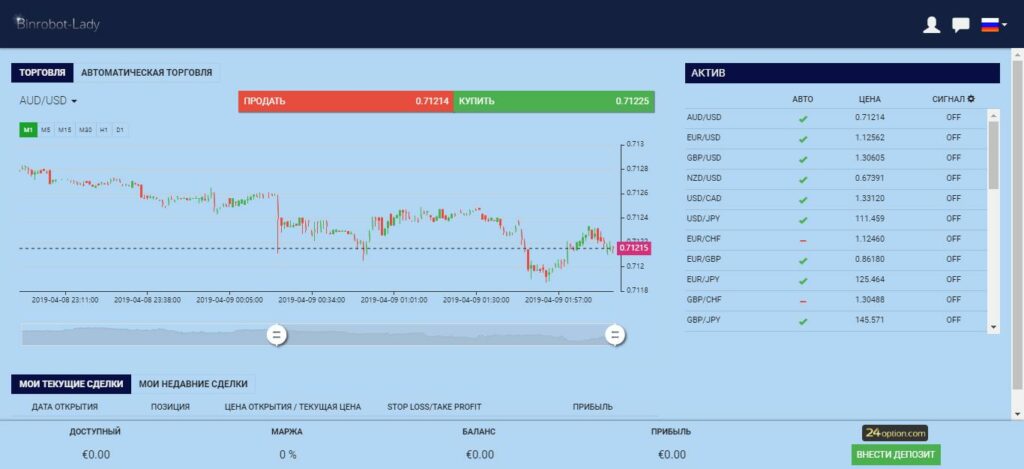 Сразу после регистрации на сайте открывается счет у брокера 24Option. Работать с реальными деньгами можно только после пополнения счета. Обычная схема заработка на партнерке с брокером.