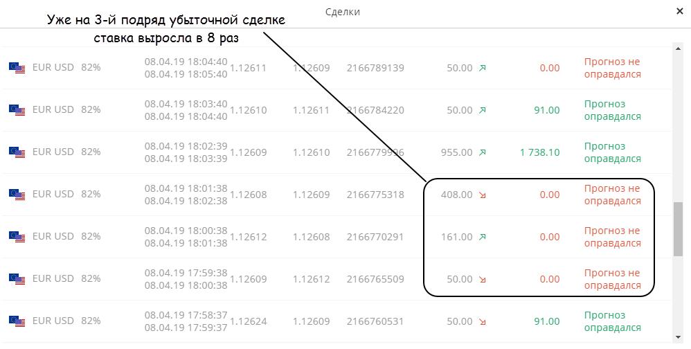 - Разобраться со стратегией торговли. Вы должны понимать, на основе чего получаете точки входа. Мартингейл лучше исключить. В случае с БО он особо опасен, выплата всегда меньше 100%, поэтому ставку приходится увеличивать более чем в 2 раза, чтобы выйти в ноль. Это сильно загружает депозит.