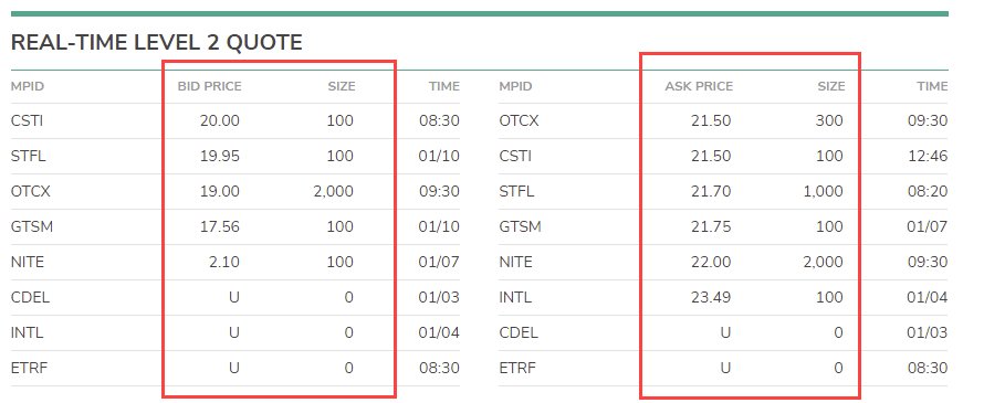 Отсюда следует еще один недостаток – высокие спреды. Они могут превышать 10-20%, иногда встречается разрыв между Бидом и Аском выше 50%. Например, по NITE Бид равен $2,10, при этом Аск – $22,00, а объемы на покупку и продажу отличаются в 20 раз. Эта особенность ОТС рынка делает невозможным активный трейдинг.