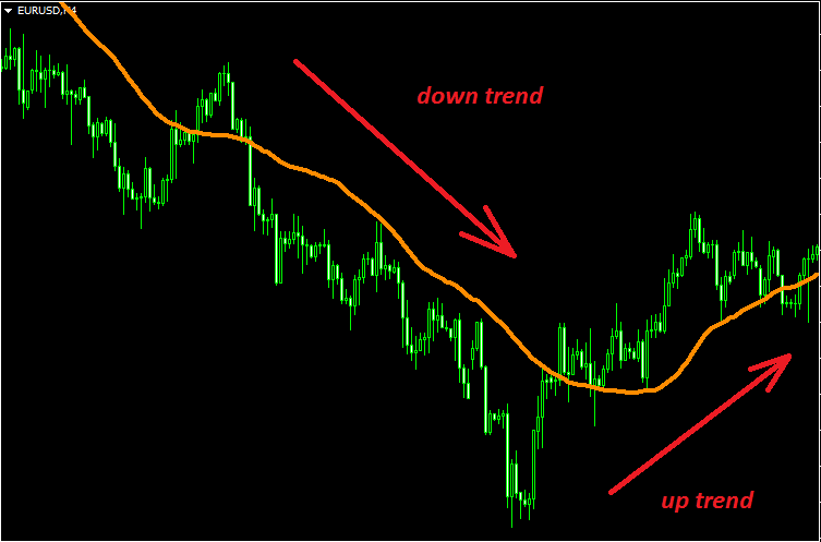 1. Указание тренда. Индикатор не просто так находится в графе “Трендовые”. Он показывает общее направление рынка, которое в данный момент является приоритетным с точки зрения средних цен. Вот как это рассматривается:
