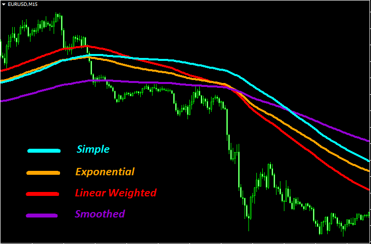 Усреднять значения можно по-разному. Индикатор moving average даёт возможность выбрать один из стандартных типов алгоритма расчёта, которые пользуются популярностью у трейдеров. Одни виды больше подходят для использования в долгосрочных стратегиях, другие же, наоборот, хорошо себя проявляют при скальпинге, иногда в одной торговой системе совмещаются несколько разных типов. Итак, рассмотрим виды скользящих: