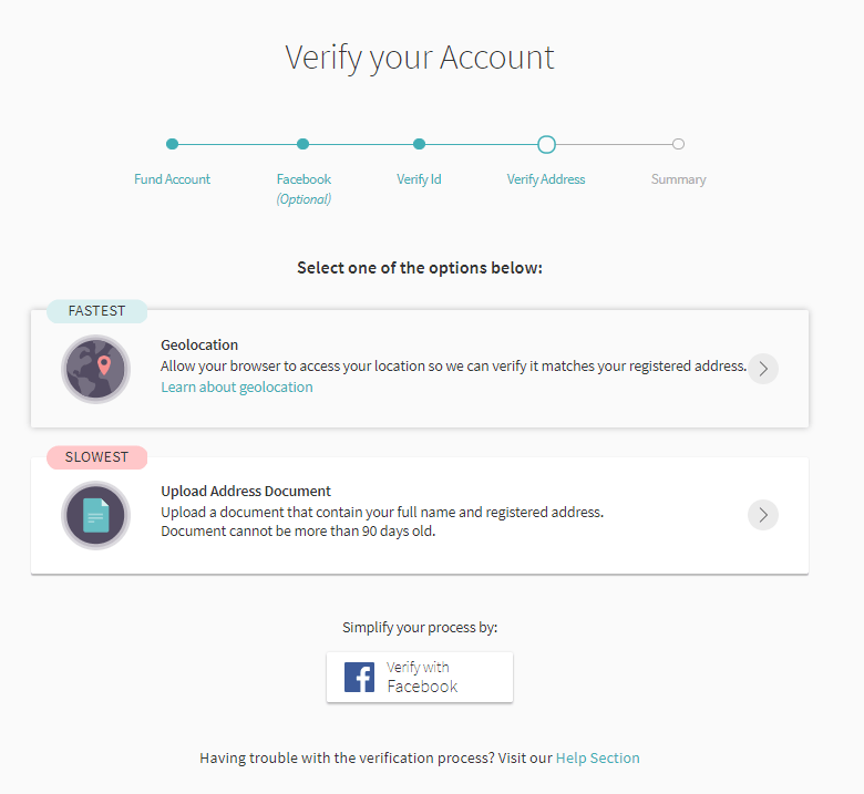 Верификация адреса - после загрузки документов, подтверждающих адрес проживания, остается ждать пока техподдержка разберется с ними. Уведомление придет на email.