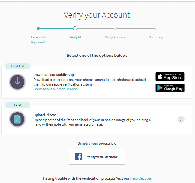 - есть вариант верификации через Facebook, подходит для европейцев, но для жителей СНГ, судя по отзывам в сети, через него удается верифицироваться редко. Есть отдельное приложение для верификации через мобильные устройства и классический способ – загрузка сканов документов;