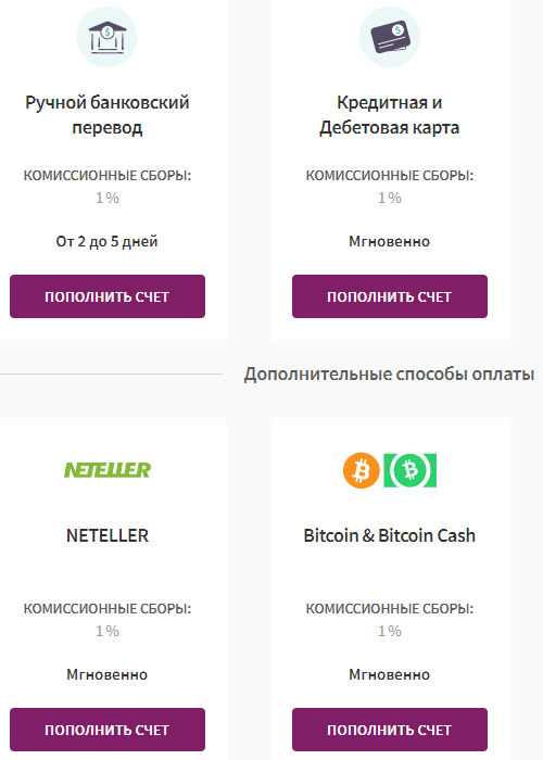 - при пополнении счета через банк, Neteller, криптовалюту или с банковской карты собственная комиссия – 1%;