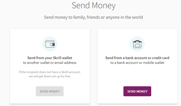 - внутри платежной системы, с одного кошелька на другой. Для этого в разделе «Send» или «Отправить» выбирается вариант «from your skrill wallet», затем указывается email получателя средств, выбирается валюта. Сам платеж осуществляется за несколько секунд, есть вариант перевода через банковский счет;