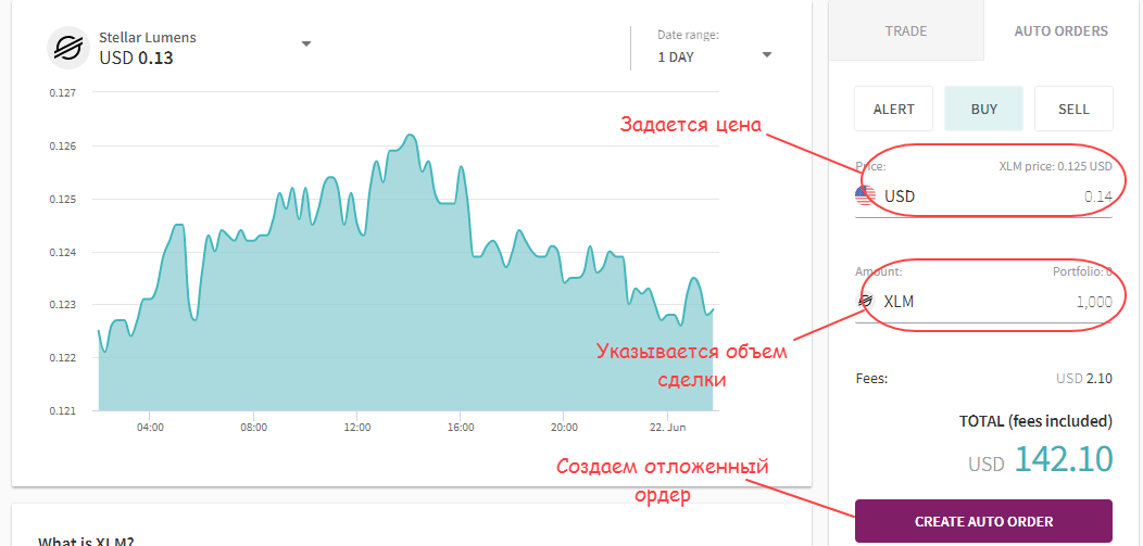 объем сделки - для работы с отложенными ордерами перейдите во вкладку «Auto orders». Здесь можно либо выставить отложенный ордер, либо создать алерт, чтобы не пропустить момент, когда цена крипты достигнет нужного уровня.
